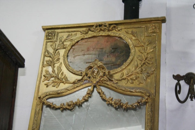 Imperdible espejo de sala tipo Trumeau con marco dorado con una pintura en su parte superior Con bellas guirnaldas que decoran la estructura, es ideal para colocar en cualquier ambiente de su hogar El vidrio del espejo es biselado |