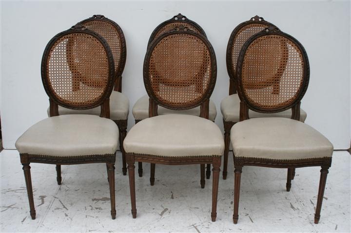 Espectacular juego de 6 sillas estilo francés Luis XVI con respaldo de esterilla Son ideales para completar de forma única su juego de comedor El tapizado es antiguo consulte por retapizado, precios convenientes – Consultar por el estado de las esterillas antes de ofertar |
