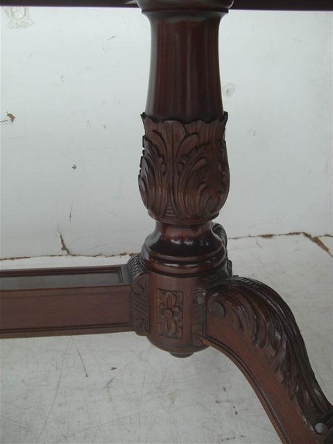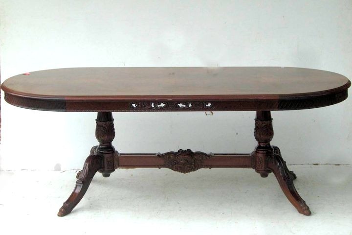 Espectacular mesa de comedor antigua con doble bocha Es ideal para completar su juego de comedor con una pieza de calidad excepcional Se entrega con el relustrado a nuevo de la estructura de madera, lista para usar |