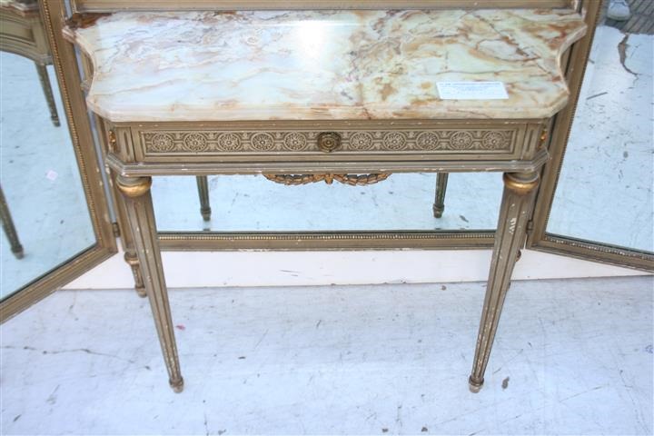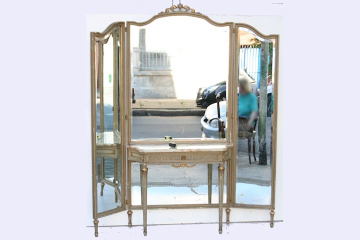 Espectacular probador estilo francés Luis XVI patinado con mármol Es ideal para embellecer de forma única su dormitorio Poseen dos prácticos cajones con tiradores de bronce Los vidrios de los espejos son biselados |