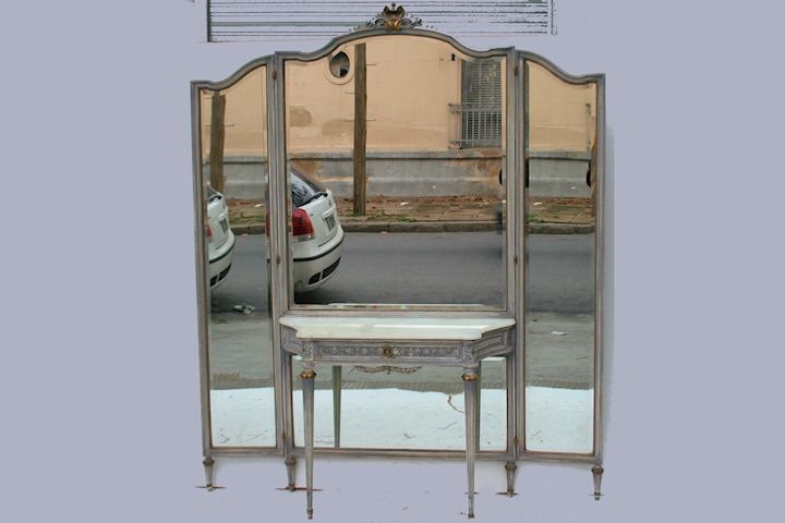 Espectacular probador estilo francés Luis XVI patinado con mármol Es ideal para embellecer de forma única su dormitorio Poseen dos prácticos cajones con tiradores de bronce Los vidrios de los espejos son biselados |