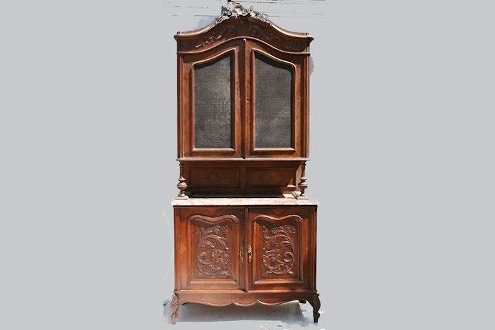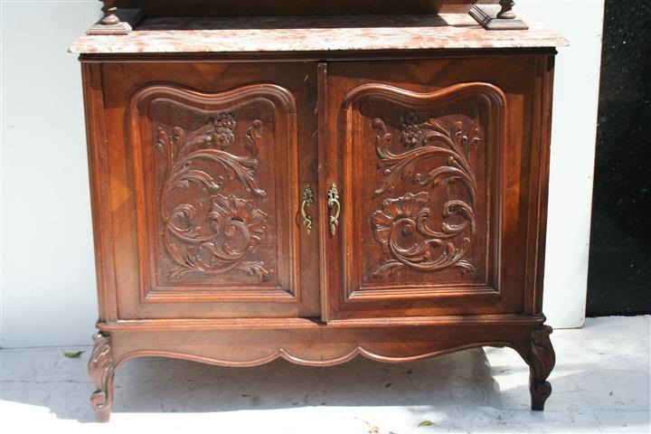Espectacular aparador de estilo francés Luis XV con tapa de mármol y alzada De calidad excepcional, es ideal para colocar en cualquier ambiente de su hogar Posee prácticas puertas y cajones |