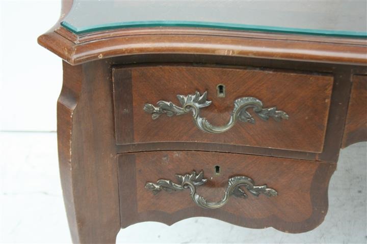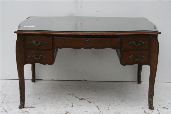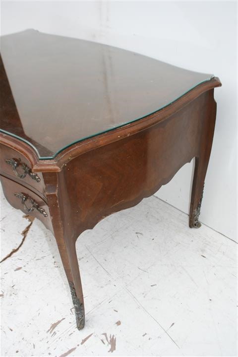 Espectacular escritorio antiguo estilo francés Luis XV de 5 cajones y doble frente Es ideal para embellecer de forma única su estudio, dormitorio o cualquier ambiente de su hogar La tapa de vidrio protectora presenta algunas cachaduras Consultar por el relustrado a nuevo del escritorio |