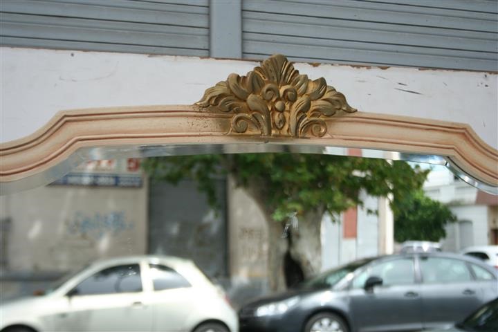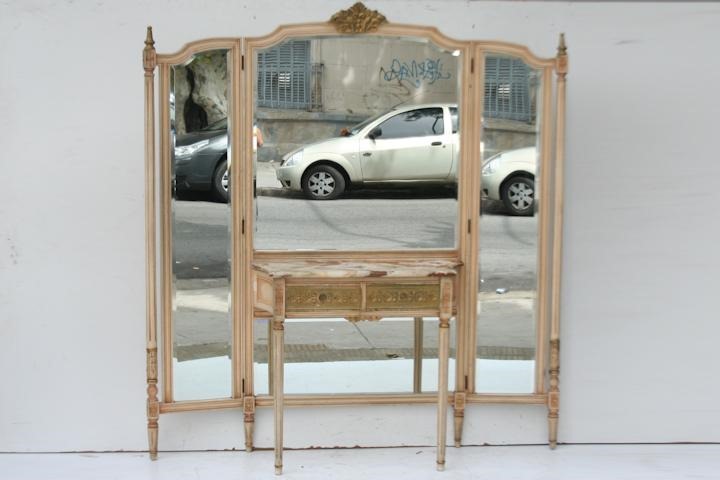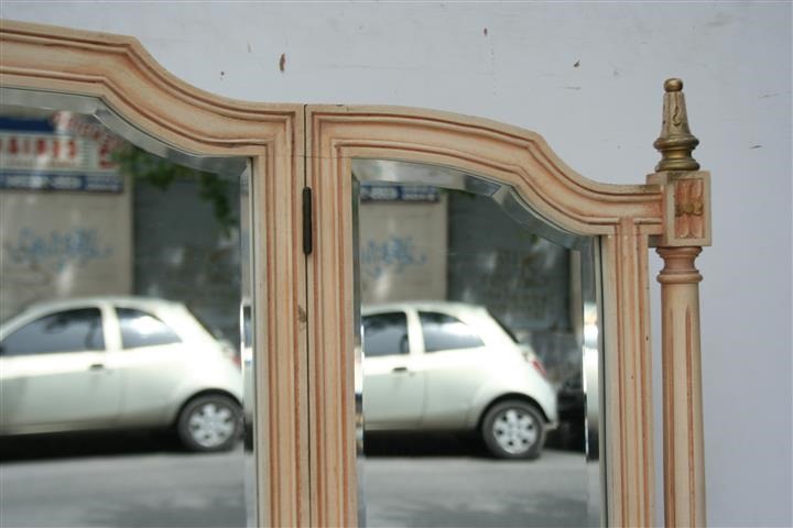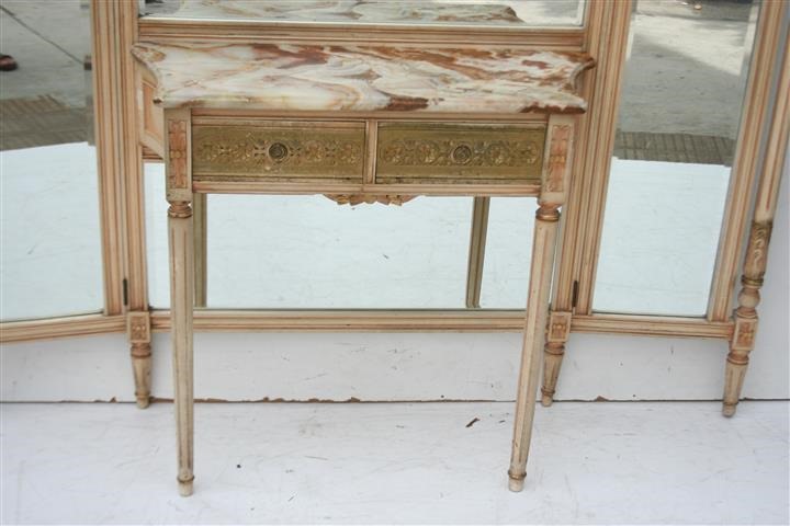Espectacular probador estilo francés Luis XVI patinado con mármol Es ideal para embellecer de forma única su dormitorio Poseen dos prácticos cajones con tiradores de bronce Los vidrios de los espejos son biselados |