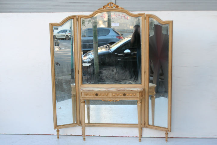Espectacular probador estilo francés Luis XVI patinado con mármol Es ideal para embellecer de forma única su dormitorio Poseen dos prácticos cajones con tiradores de bronce Los vidrios de los espejos son biselados |