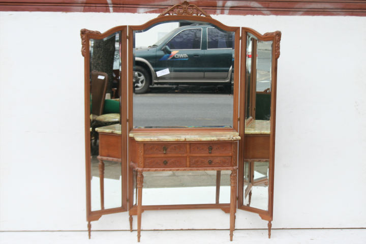 Espectacular probador estilo francés Luis XVI con mármol Es ideal para embellecer de forma única su dormitorio Poseen cuatro prácticos cajones con tiradores de bronce Los vidrios de los espejos son biselados |