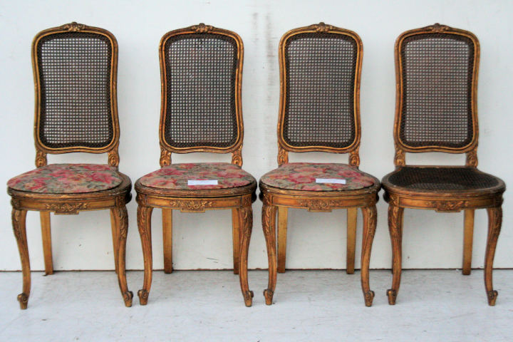 Espectacular juego de 4 sillas estilo francés Luis XV doradas con esterilla Son ideales para completar de forma única su juego de comedor El tapizado es antiguo consulte por retapizado, precios convenientes – |