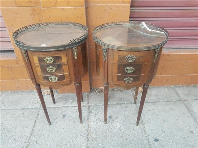 Espectacular par de mesas de luz estilo francés Luis XVI con tapa de vidrio Y barandade bronce tipo tambor