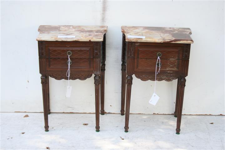 -Par de mesas de luz estilo francés Luis XVI con tapa de mármol patinadas