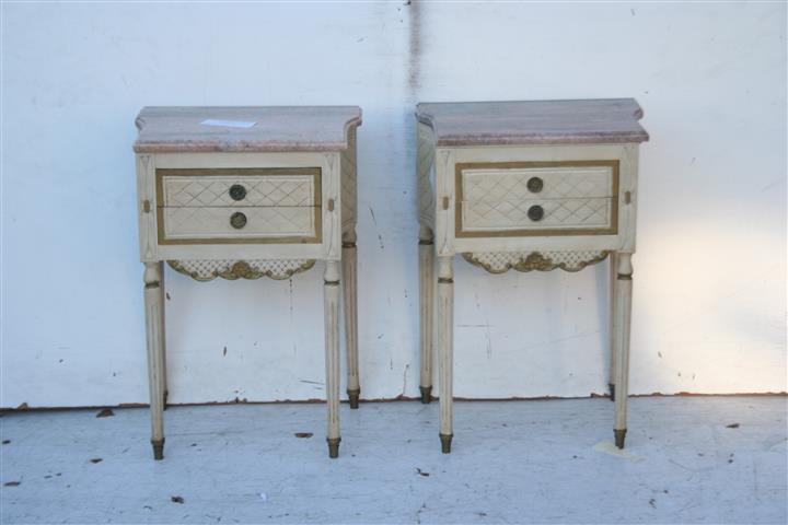 -Par de mesas de luz estilo francés Luis XVI patindas con tapa de mármol