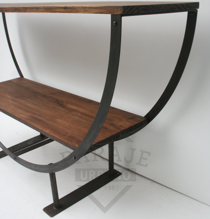 Estantería semicircular realizada con hierro y maderas de demolición.