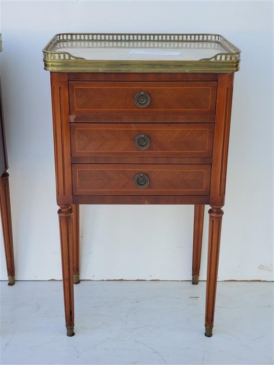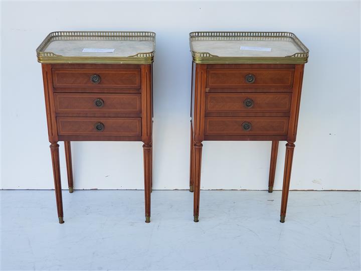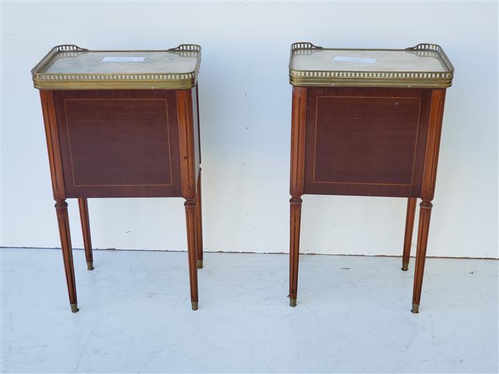 -Par de mesas de luz estilo francés Luis XVI con tapa de mármol y baranda de bronce