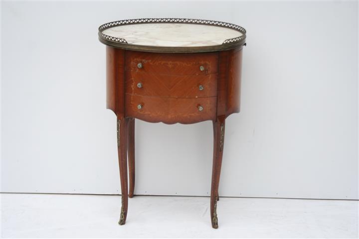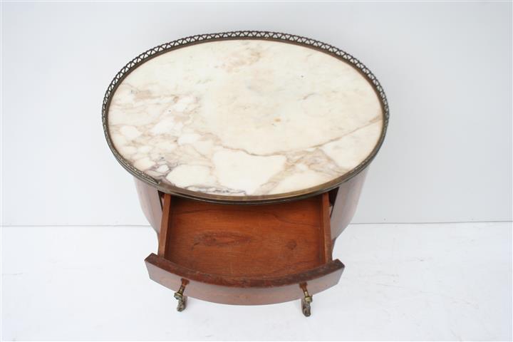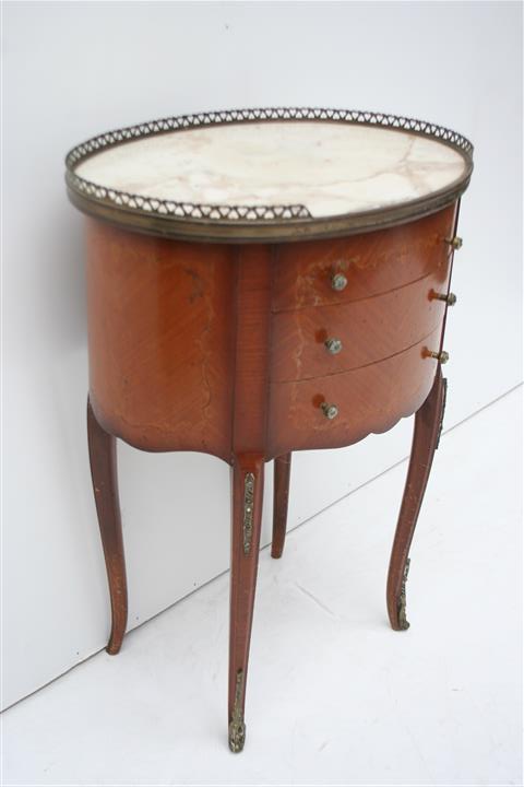 -Par de mesas de luz estilo francés Luis XV tipo tambor con tapa de mármol y baranda de bronce