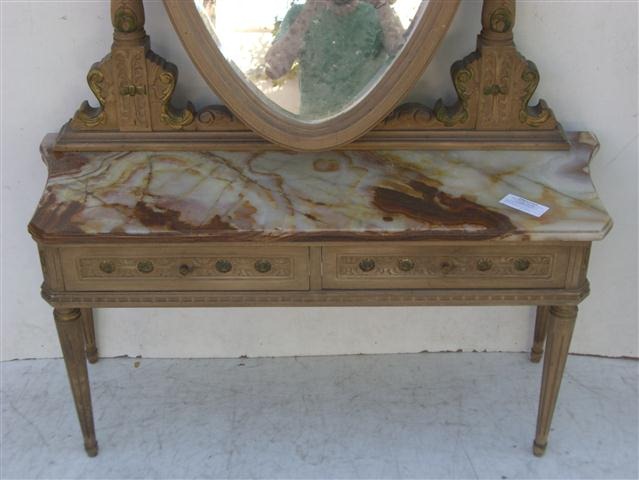 Espectacular Toilette con espejo estilo francés Luis XVI con tapa de mármol patinado Es ideal para embellecer de forma única su dormitorio Posee 2 prácticos cajones con tiradores de bronce El vidrio del espejo es biselado |