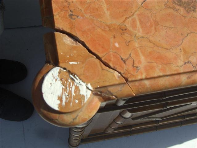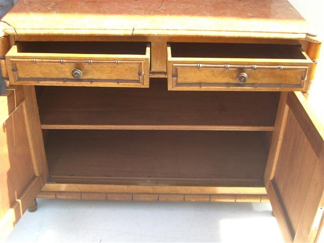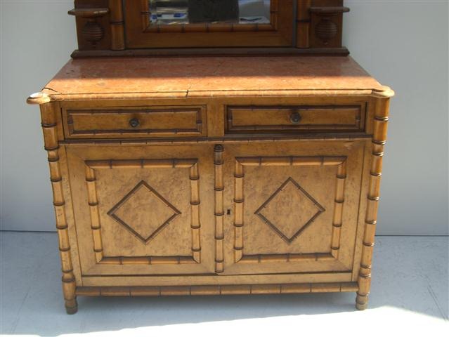 Espectacular lavatorio de falsa caña con espejo biselado y mármol Es ideal para decorar de su forma única su baño o dormorio El mármol está partido y requiere reparación Posee puertas inferiores con estante |