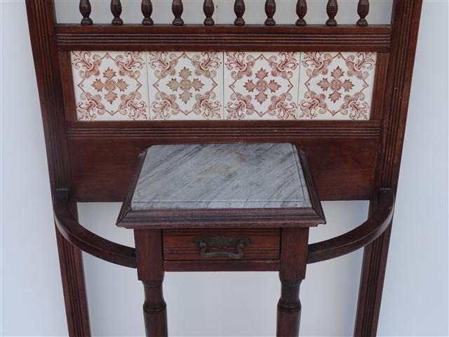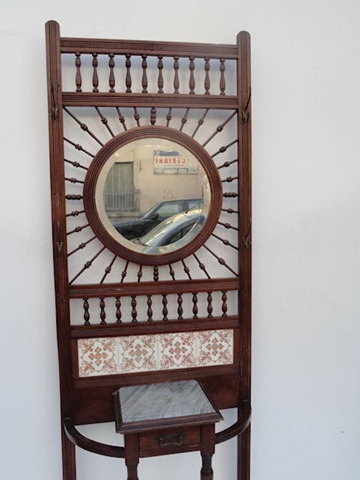Espectacular perchero de madera antiguo con espejo e incrustaciones de mayólica Es ideal para embellecer de forma única cualquier ambiente de su hogar El espejo es biselado |
