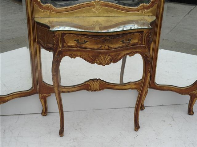 Espectacular probador estilo francés Luis XV dorado con tapa de espejo Es ideal para embellecer de forma única su dormitorio Posee un práctico cajón con tiradores de bronce Los vidrios de los espejos son biselados |