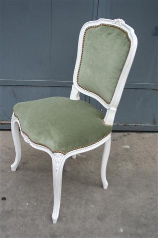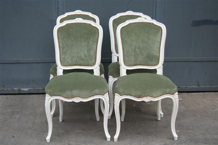 Espectacular Juego de 4 sillas estilo francés Luis XV Estan patinadas de blanco y Fueron tapizadas a nuevo Son ideales para vestir de forma única su comedor |