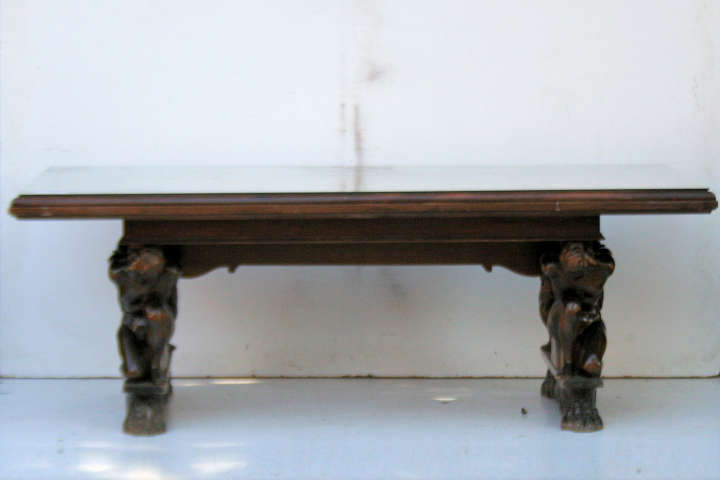 Espectacular mesa de comedor estilo tallada con dos personajes Es ideal para embellecer de forma única su comedor Incluye tapa de vidrio protectora |