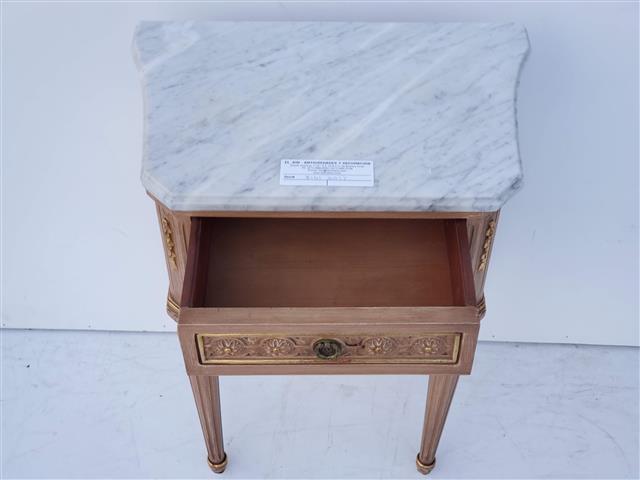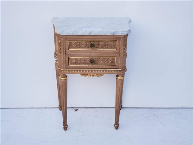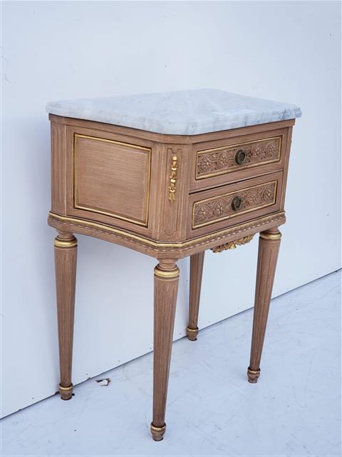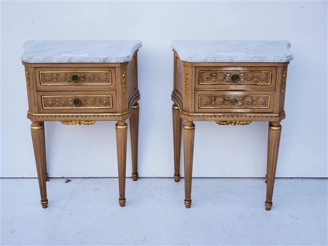 Par de mesas de luz estilo francés Luis XVI patinadas con tapa de mármol